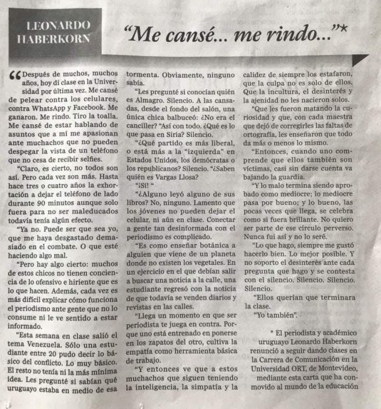 ¨“Me canse… me rindo…”. El académico uruguayo Leonardo Haberkorn ha renunciado a seguir dando clases de #periodismo en la universidad de Montevideo. Su carta ha conmovido al mundo de la educación. Demoledora.¨ Celia Maza